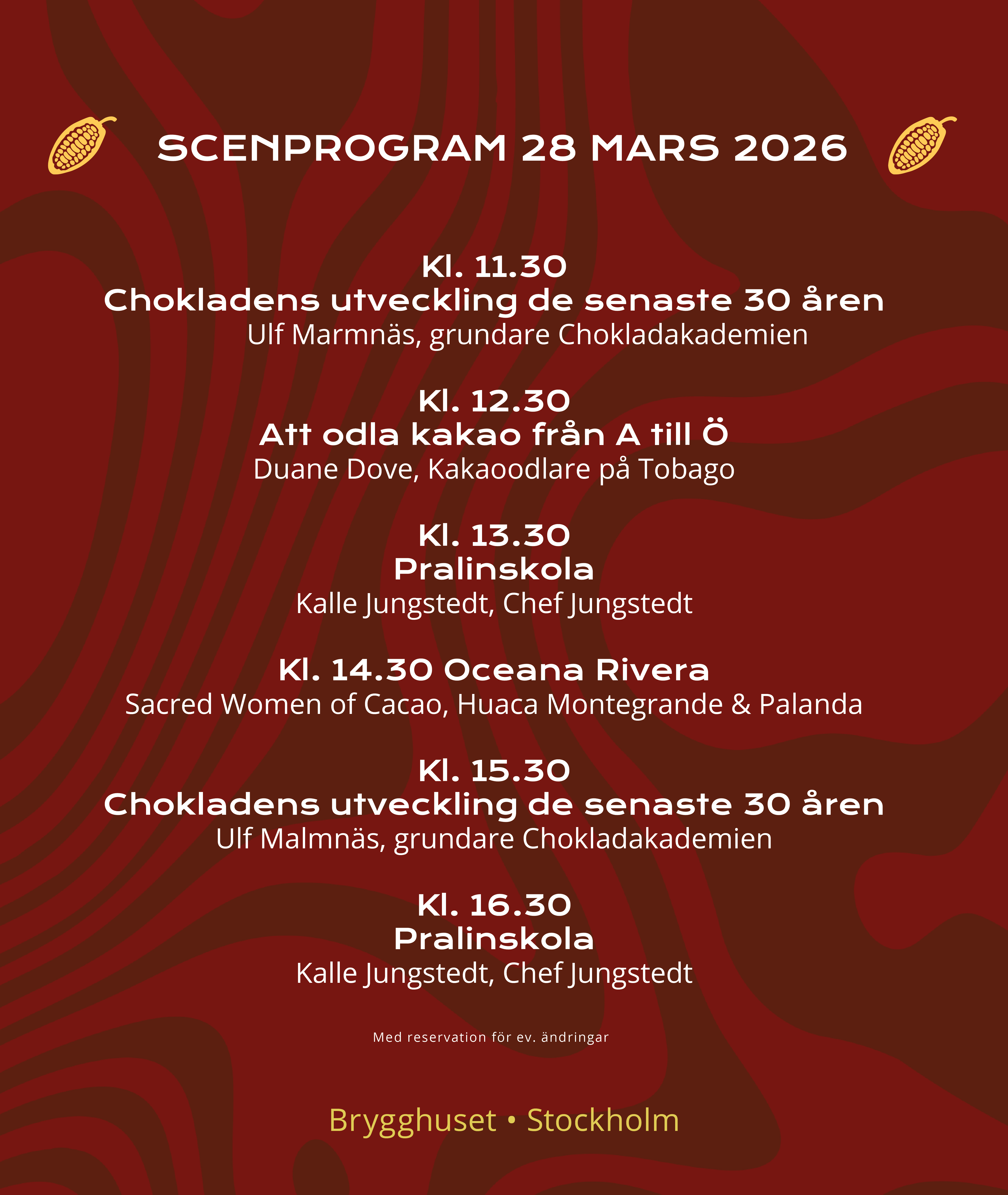 Choklad & Konfektyrfestivalen i Stockholm arrangeras 28 mars 2026 på Brygghuset. Köp din biljett redan idag!